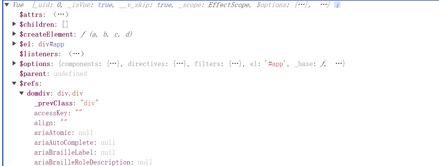 控制台(讲解为什么代码要这么写:this.$refs.domdiv.style.backgroundColor = "blue";), 我们可以从控制台的信息进行剖析: