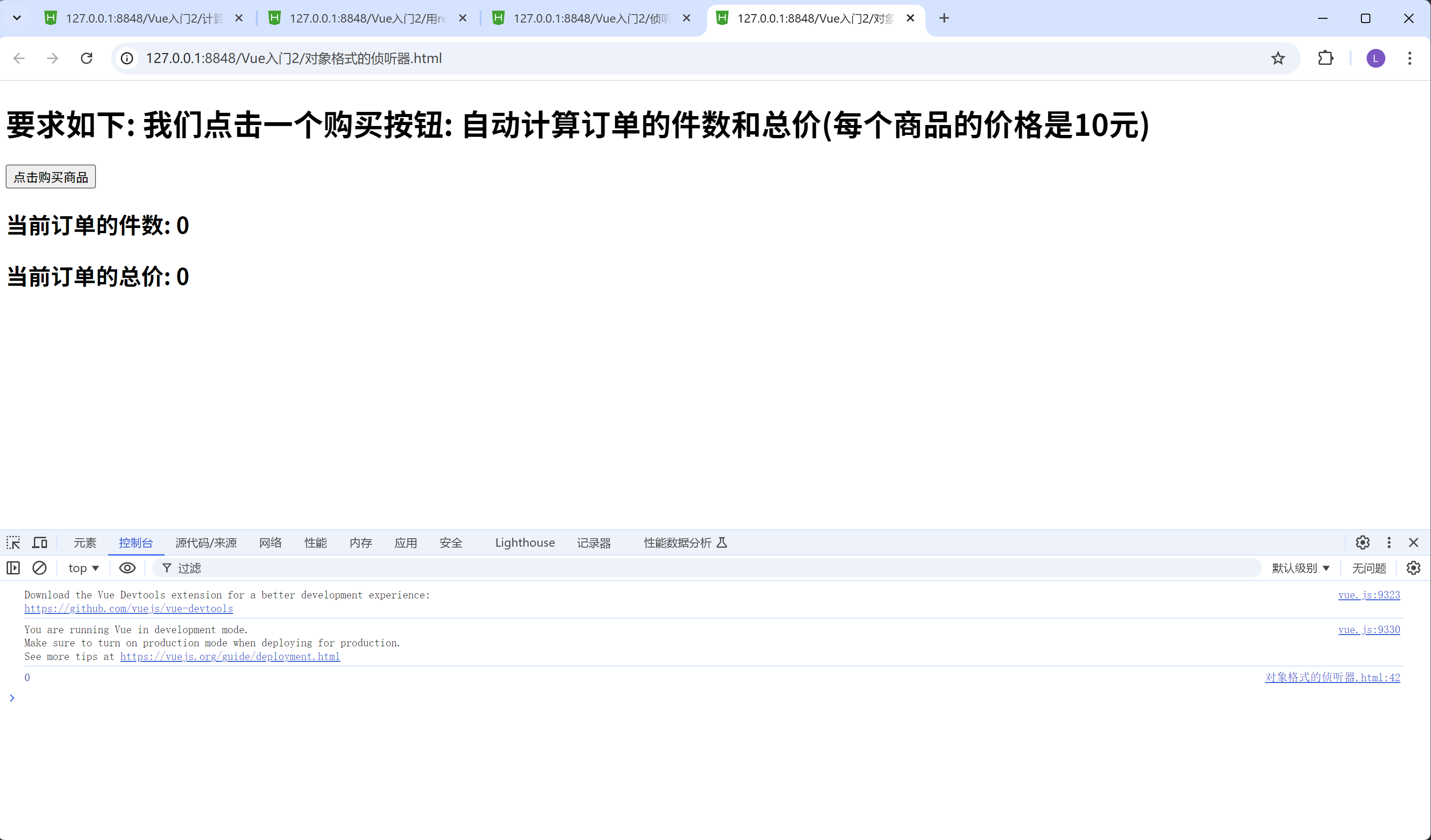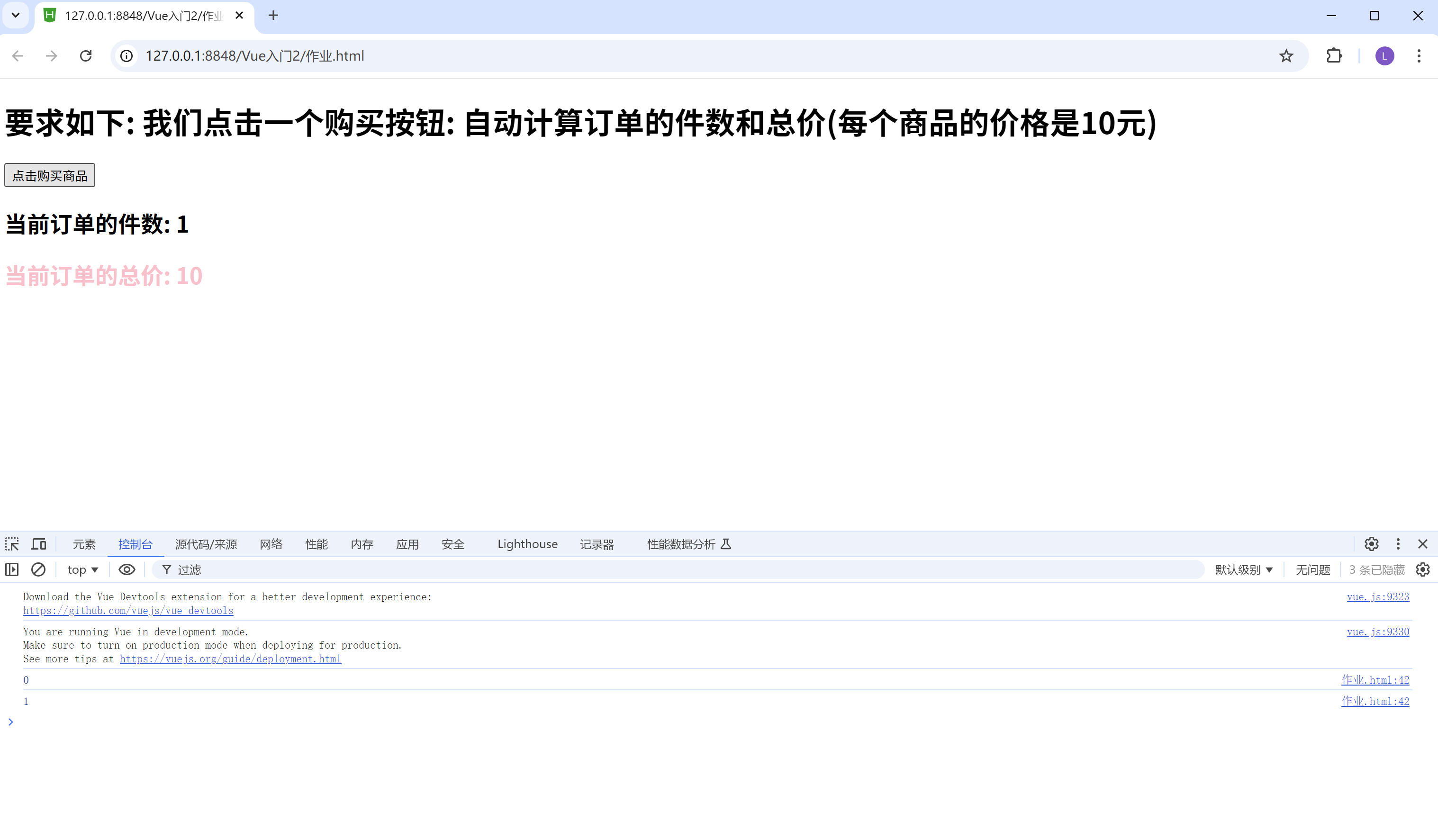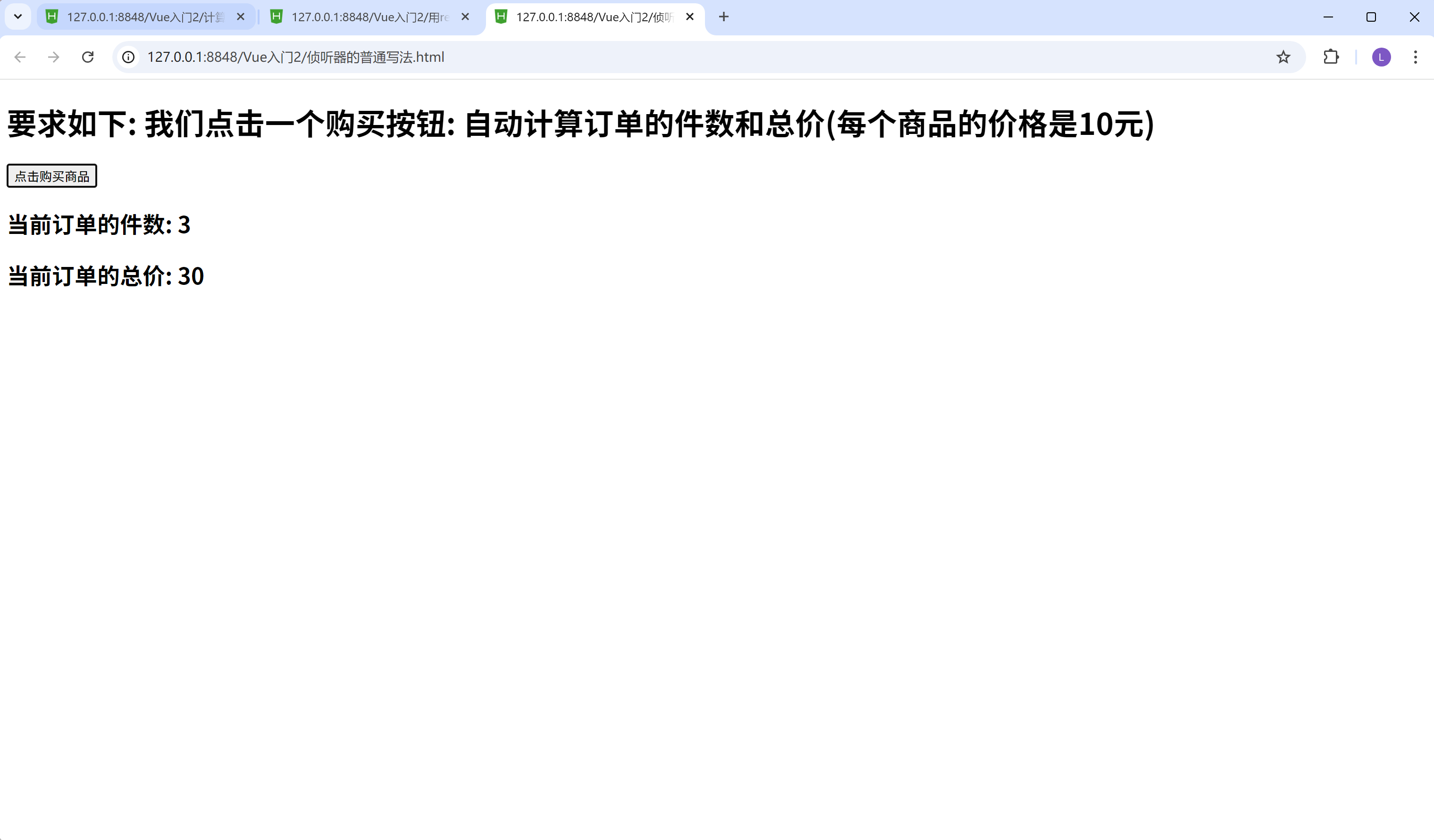 场景:我们点击一个购买按钮: 自动计算订单的件数和总价(每个商品的价格是10元)