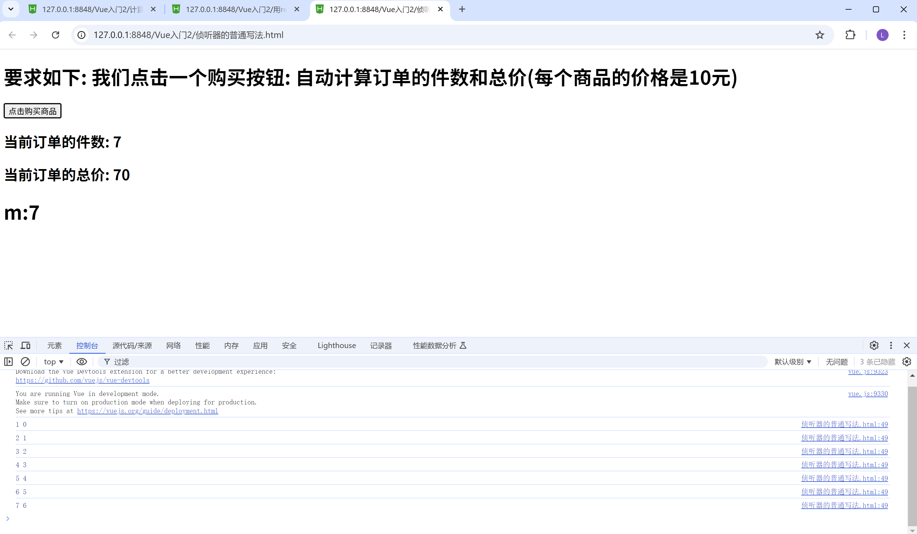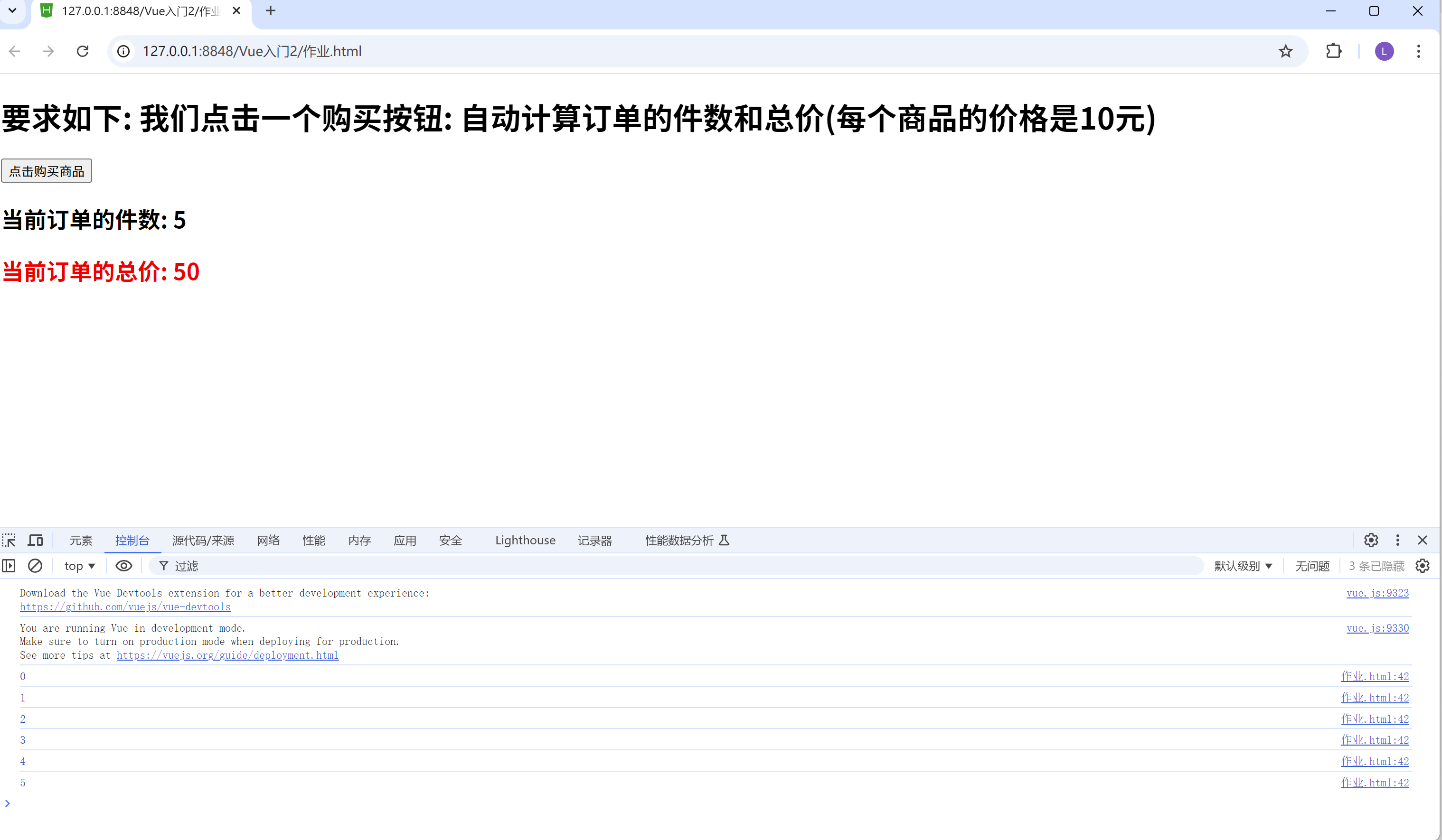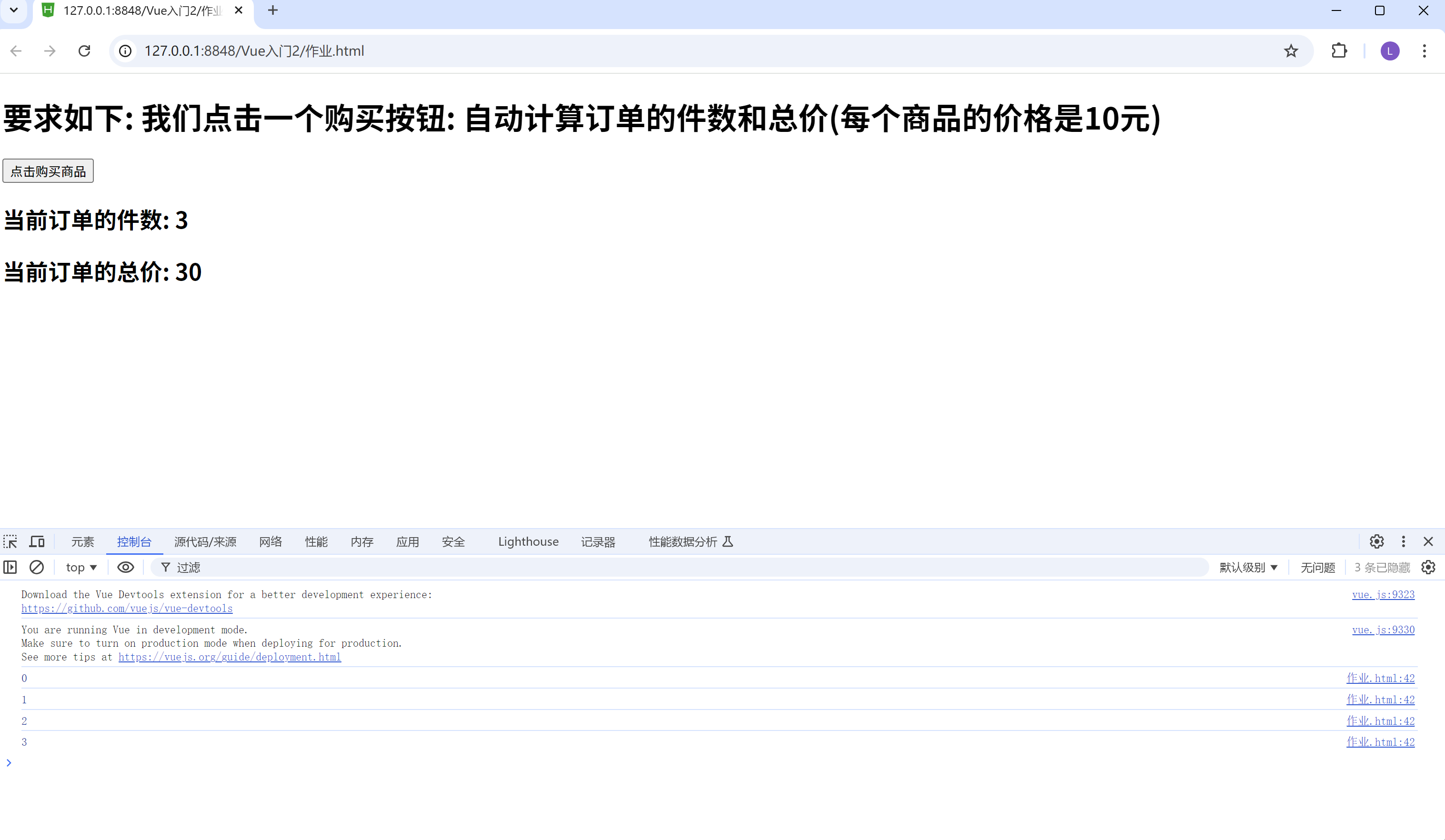 场景:我们点击一个购买按钮: 自动计算订单的件数和总价(每个商品的价格是10元)