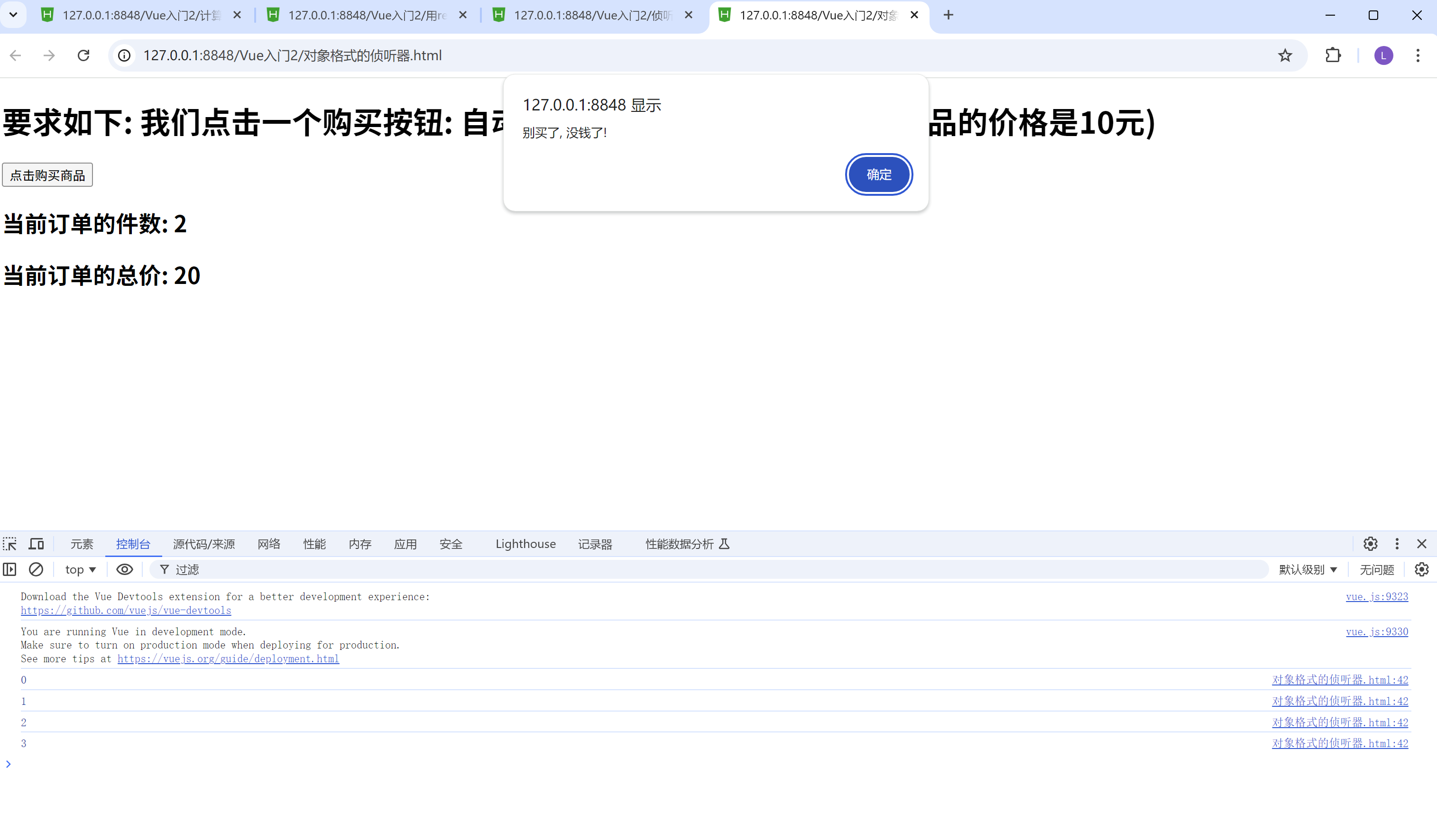 // 比如 当我的新值 购买数量 等于3 我就可以弹出一个提示框 没钱了 别买了