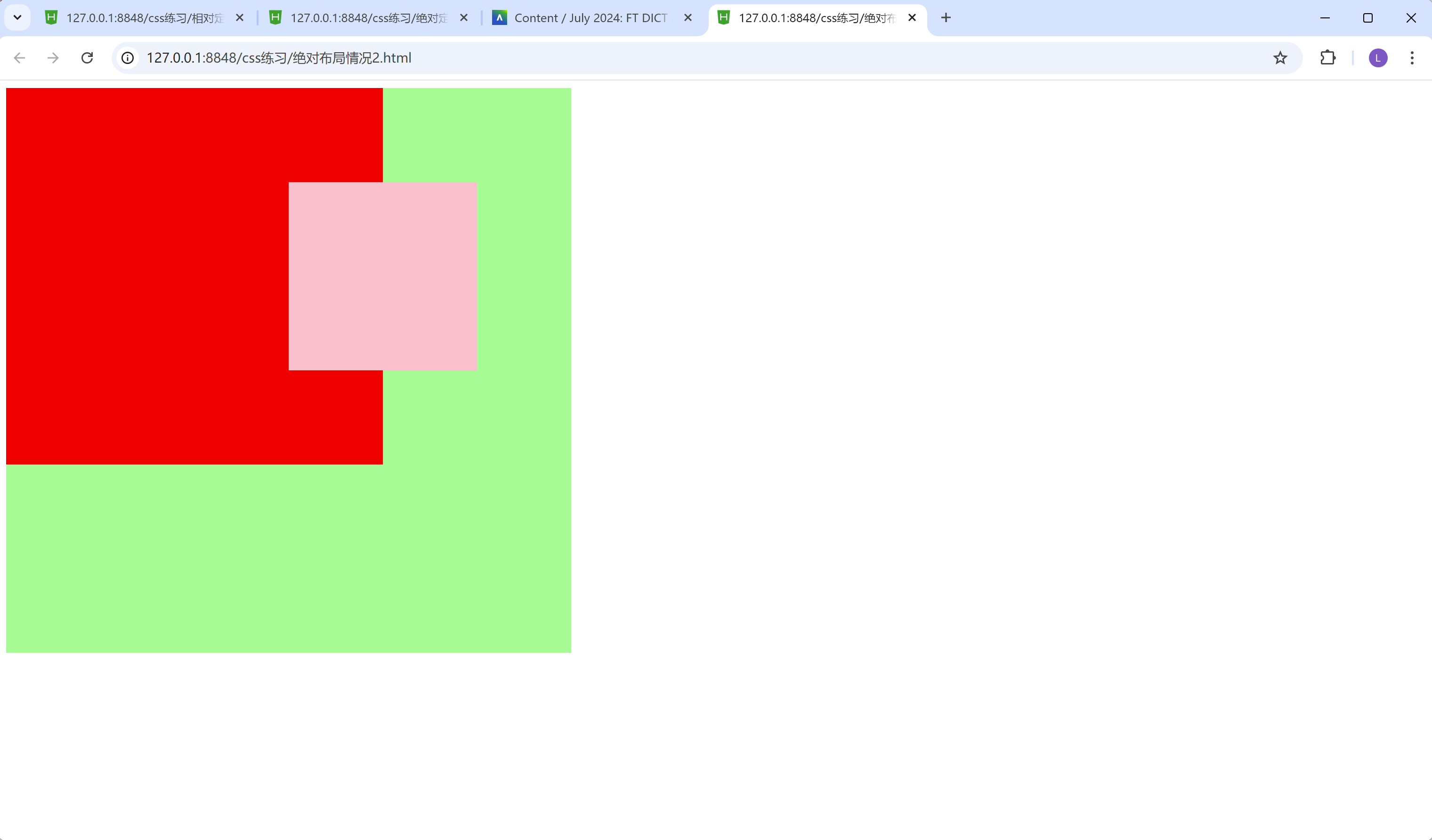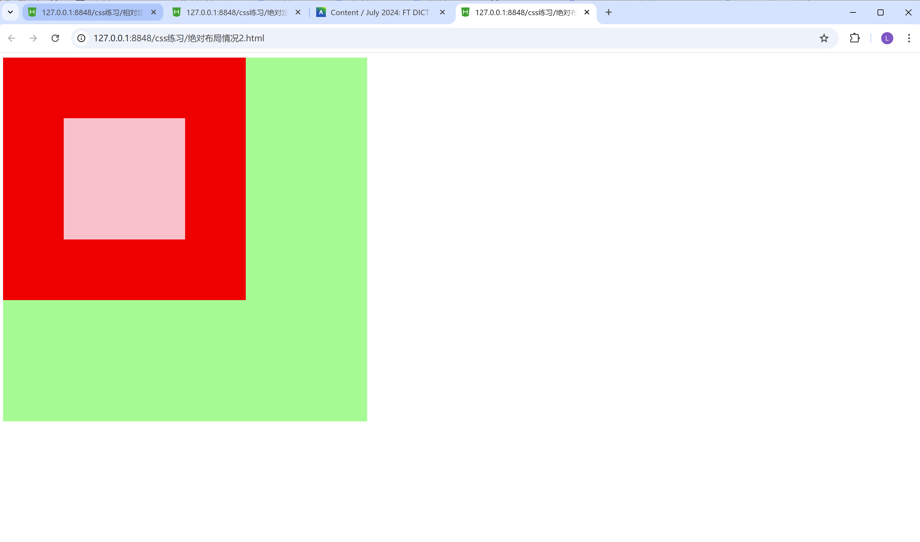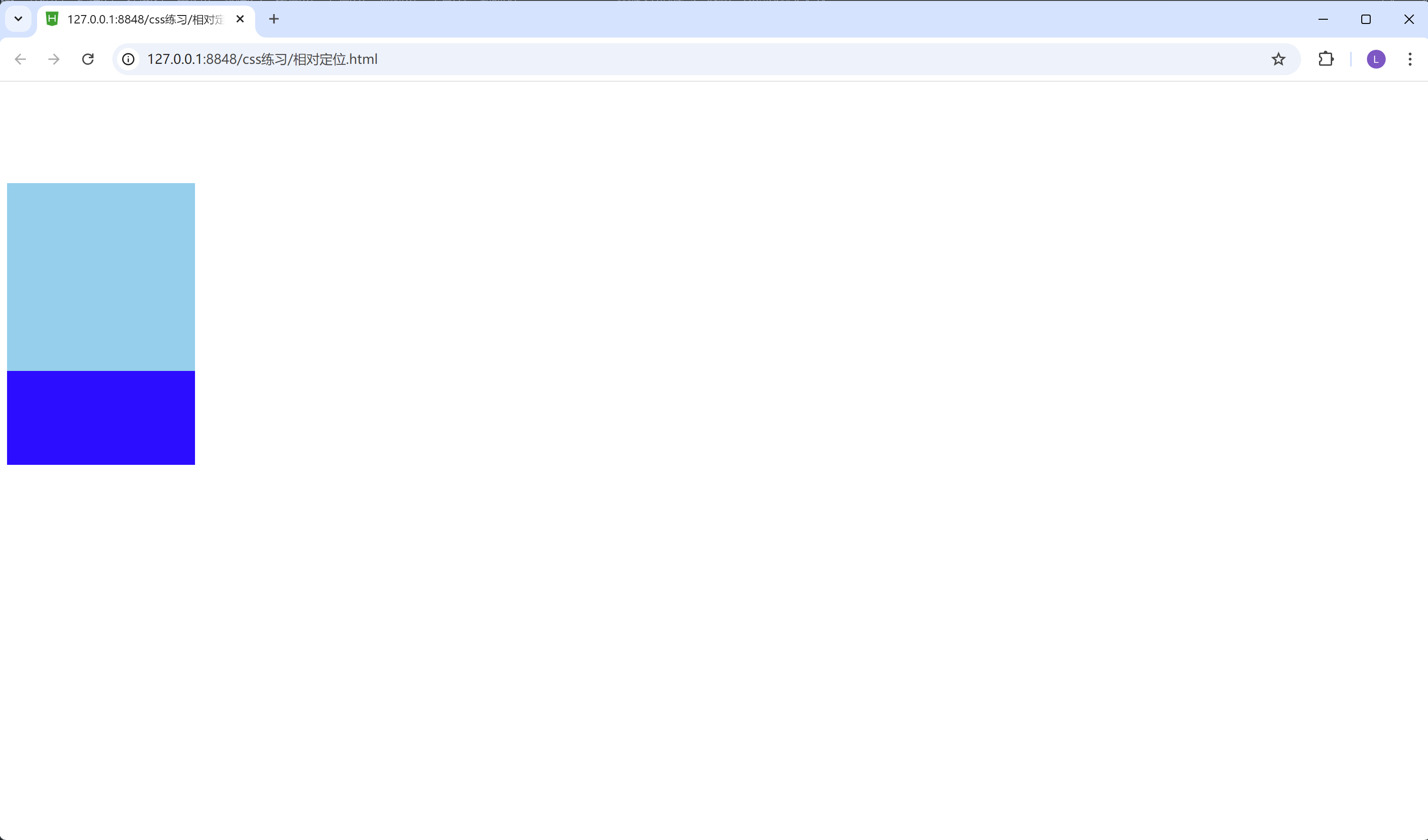 我们可以看到上面淡蓝色的框, 把下面的深蓝色的框, 给覆盖掉了。这个就是遵循相对布局特点的第二条。