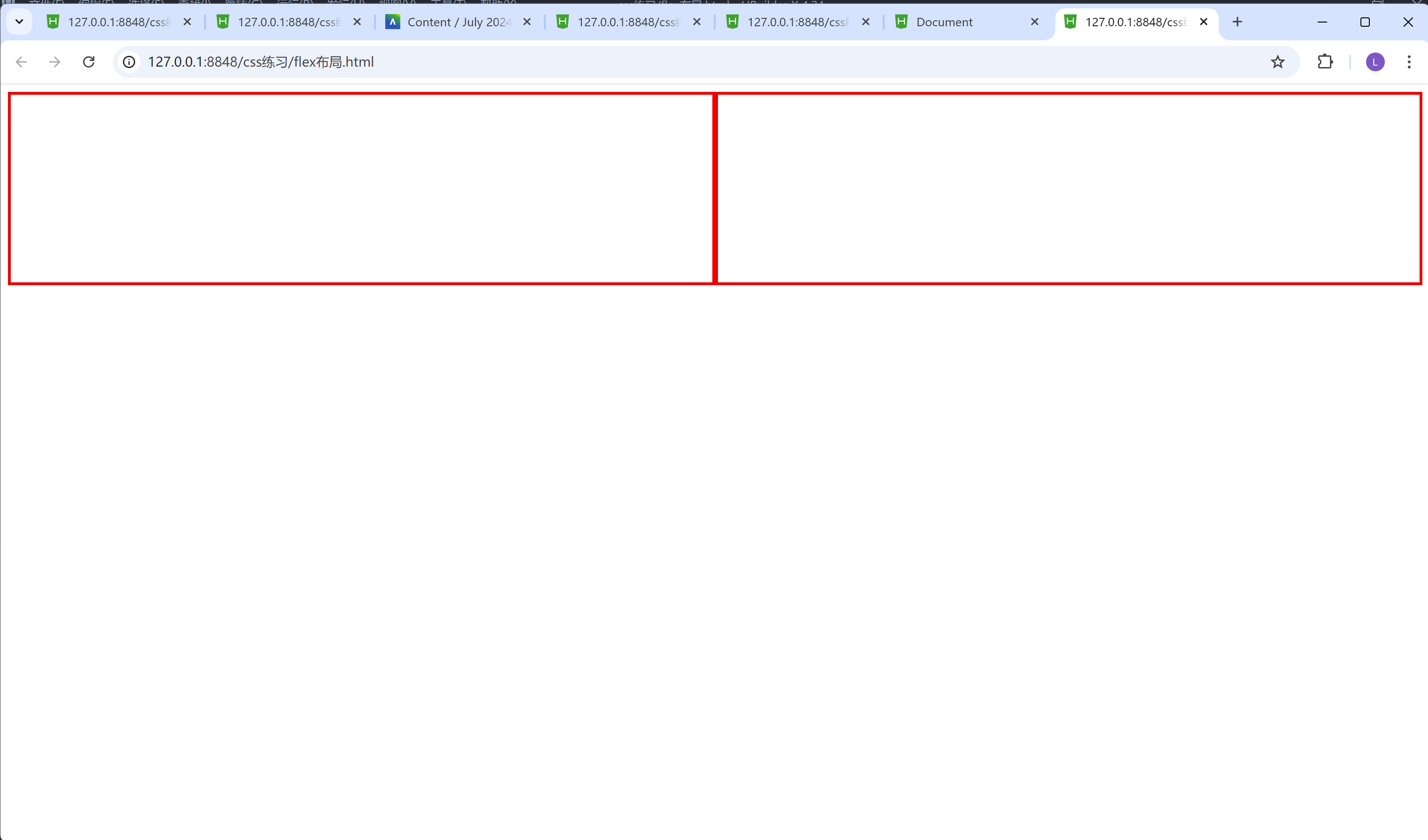 我们可以从结果的图中发现, 有两个方框, 而且占用的宽度都是平均分, 这里面就和弹性布局有关了, 我们首先在box盒子里面设置了弹性布局, 然后再inner-box盒子里面设置了一个flex: 1;这个属性, 这个属性代表着两个inner-box,它们两占领的空间都是一份, 所以一个inner-box就占用了总共大小的二分之一。当然这里我要提醒下, 如果把flex值设置为2的话, 结果也是一样的, 因为第一个inner-box占比2, 第二个inner-box占比也是2, 那这样的话, 它们两占比大小, 还是一样不变的, 相当于都是4份里面占其中2份, 也就是说四分之二同时又等于二分之一。