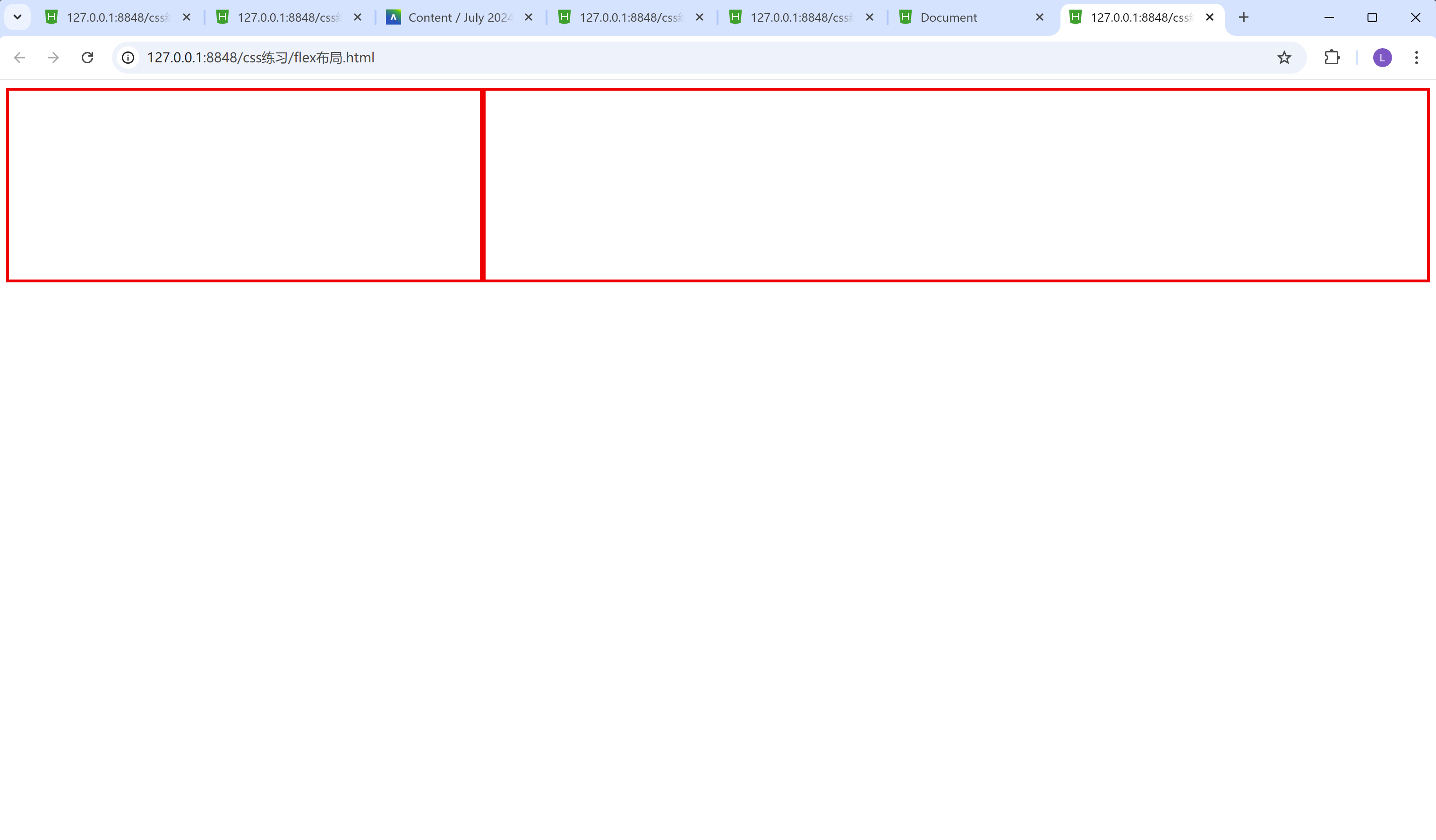 我们不难看到, 第一个盒子宽度短些, 第二个盒子宽度长些。原因也很简单, 因为我们把第一个盒子的flex的值设置成了1, 而第一个盒子的flex的值设置成了2, 那么第一个盒子占比整个盒子的三分之一, 而第二个盒子占比整个盒子的三分之二。