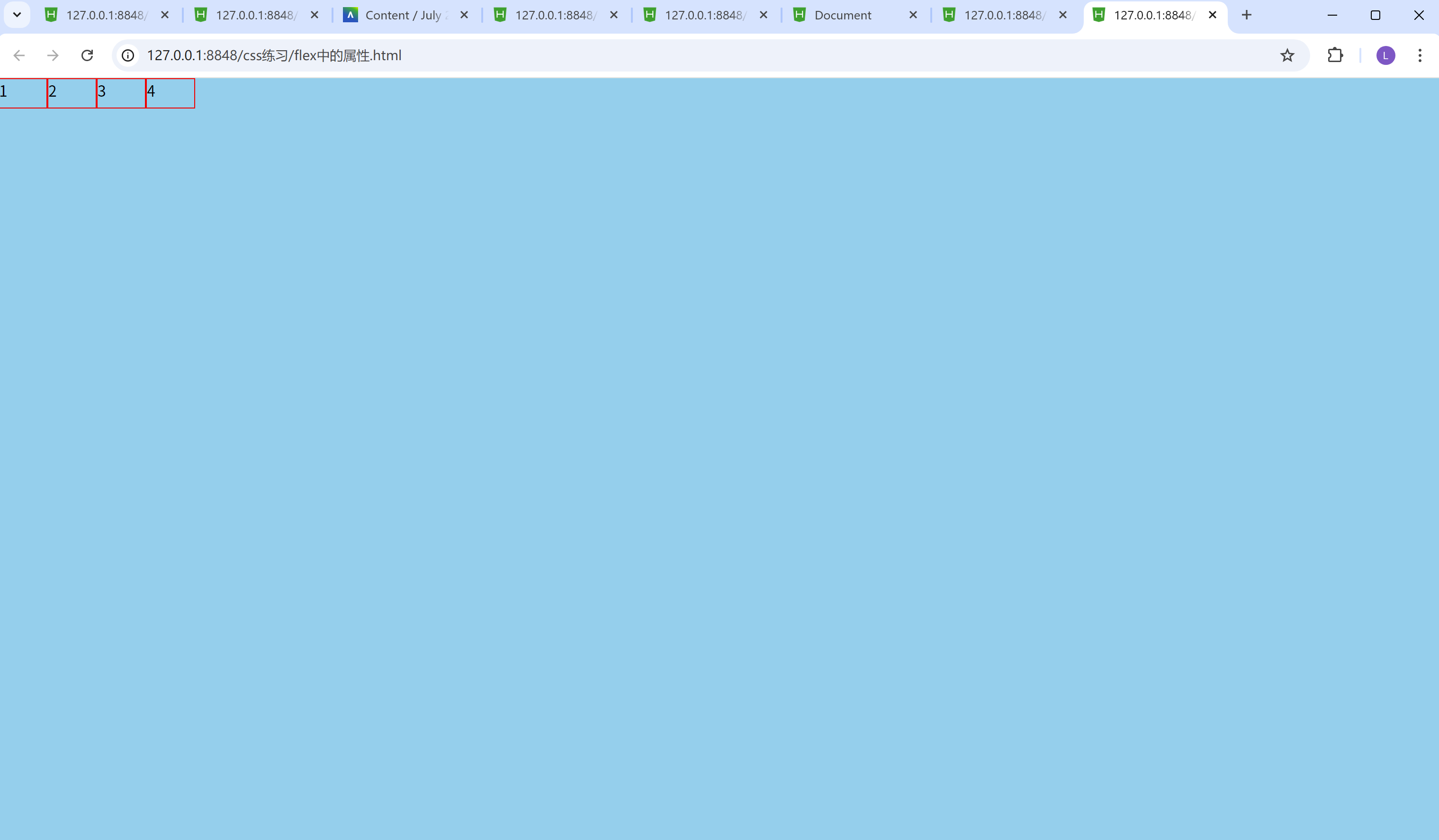 justify-content: flex-start; 通过这行代码,我们可以看到四个inner-box都在最左上方, 当然上下也有个参数叫做align-items属性, 这个一会儿我们会讲到,这里的关键是四个盒子都在最左边。