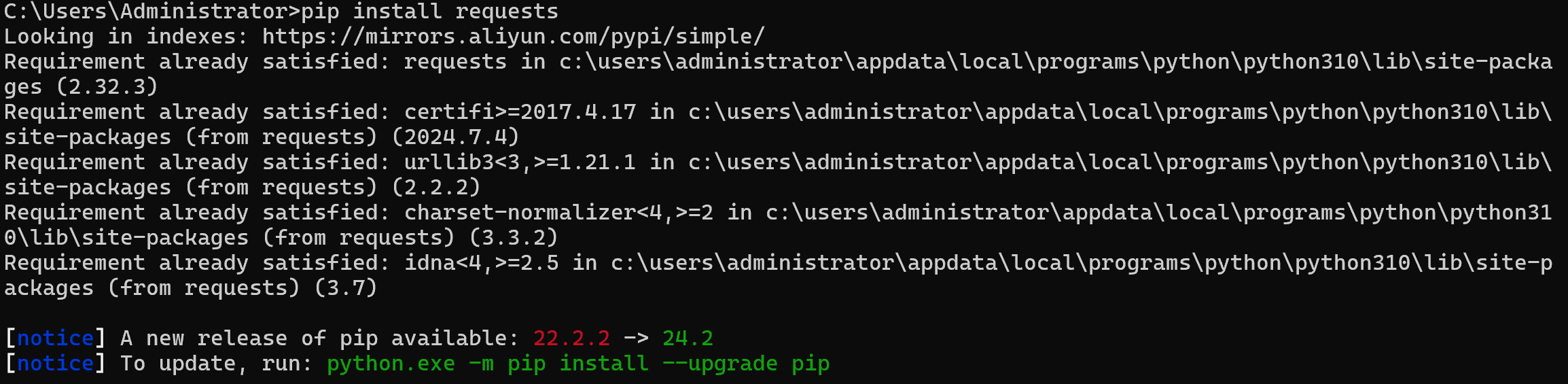 pip install requests -i https://mirrors.aliyun.com/pypi/simple/