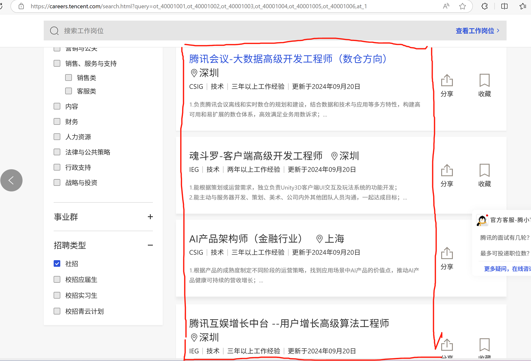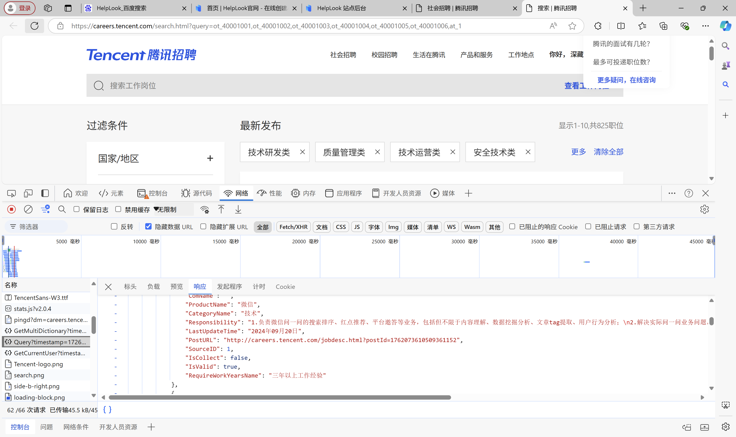 这个url是https://careers.tencent.com/tencentcareer/api/post/Query?timestamp=1726840260871&countryId=&cityId=&bgIds=&productId=&categoryId=40001001,40001002,40001003,40001004,40001005,40001006&parentCategoryId=&attrId=1&keyword=&pageIndex=1&pageSize=10&language=zh-cn&area=cn, 这个url就是我们之后要找到的请求。