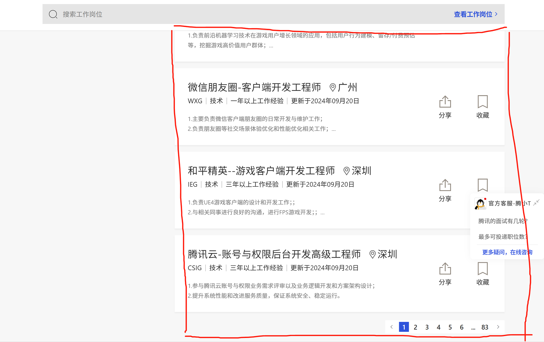 腾讯招聘网页里面, 有分页功能, 所以我们可以在url里面分析哪个参数, 是展现第几页网页的数据的。