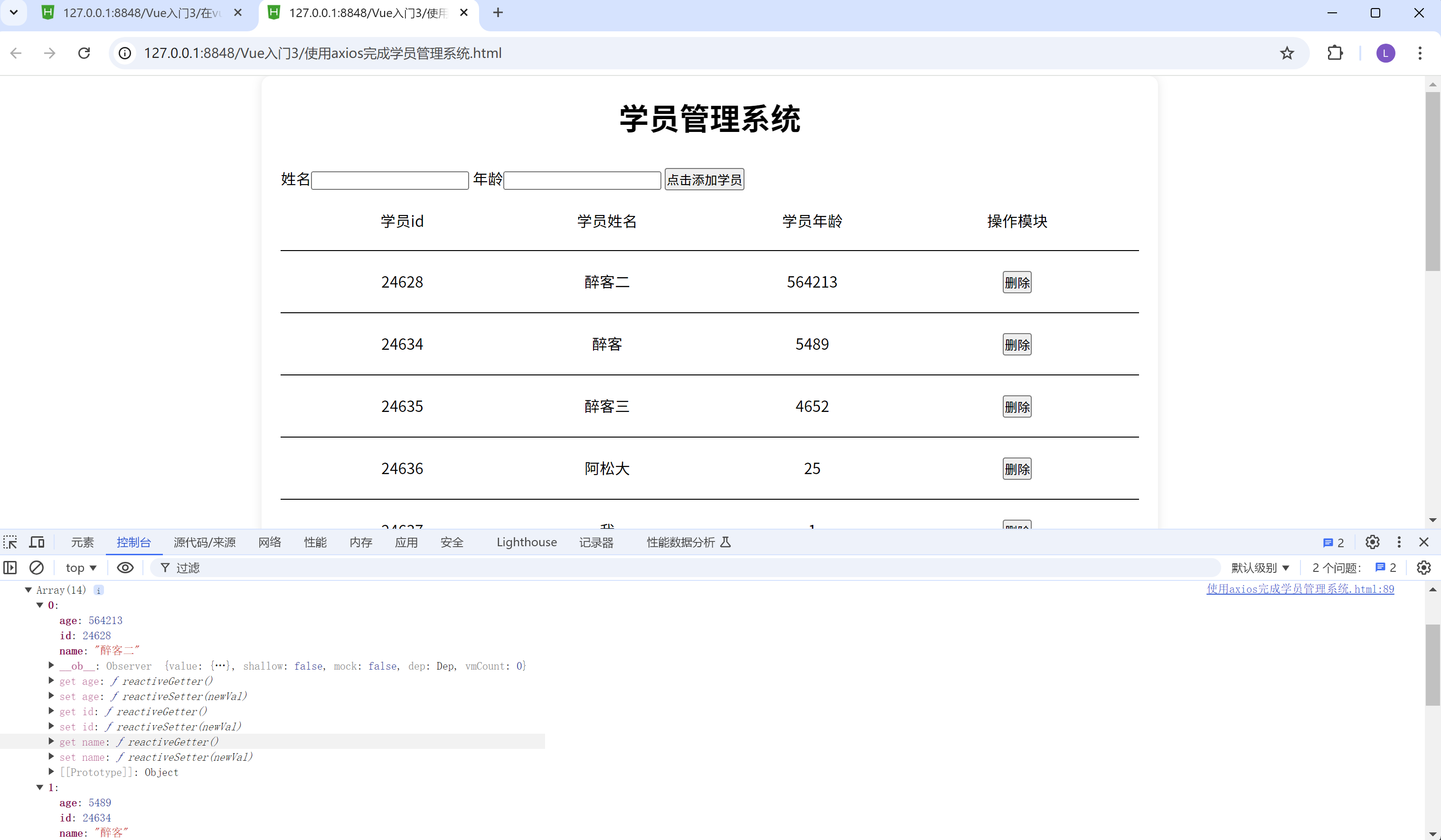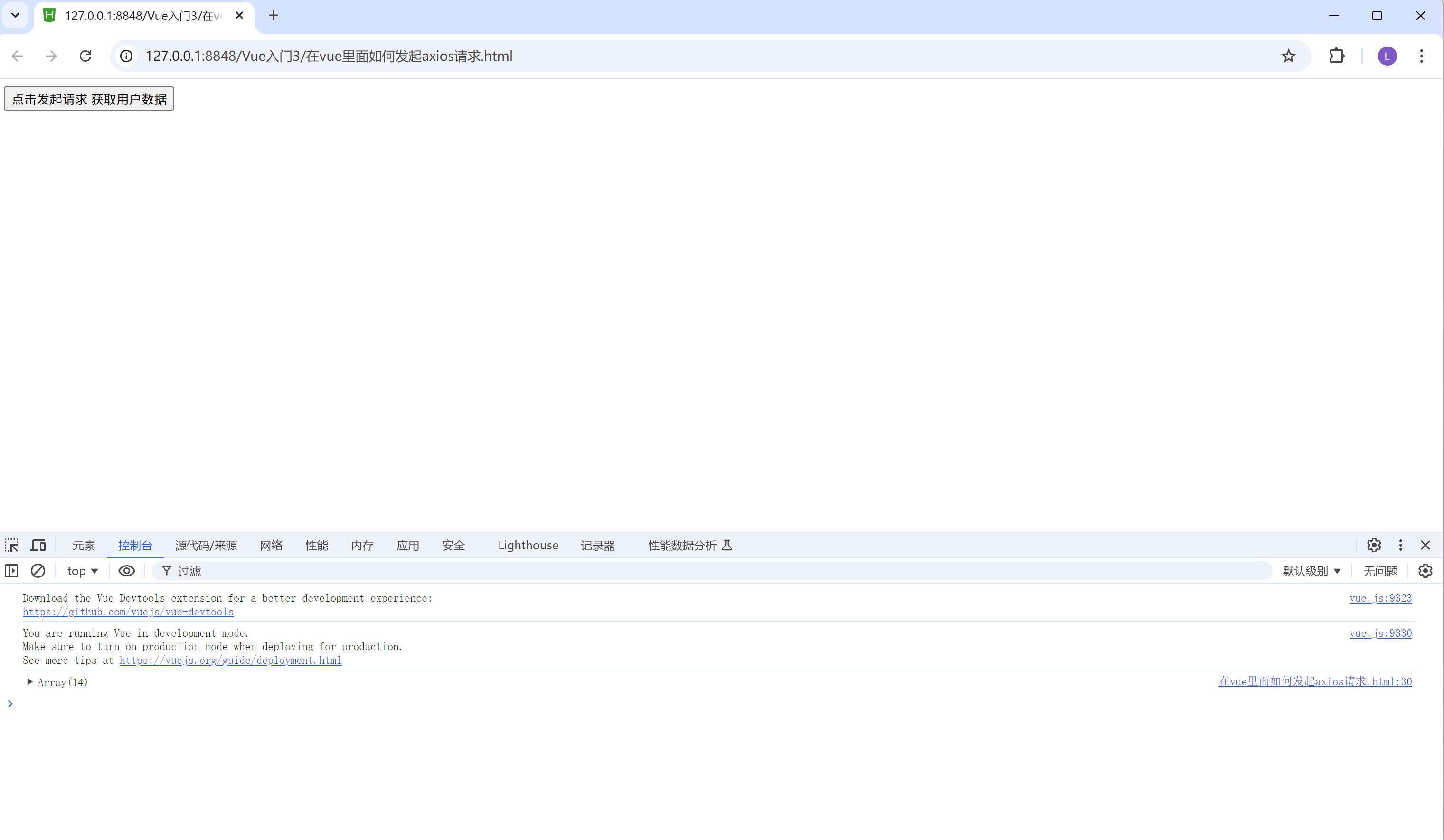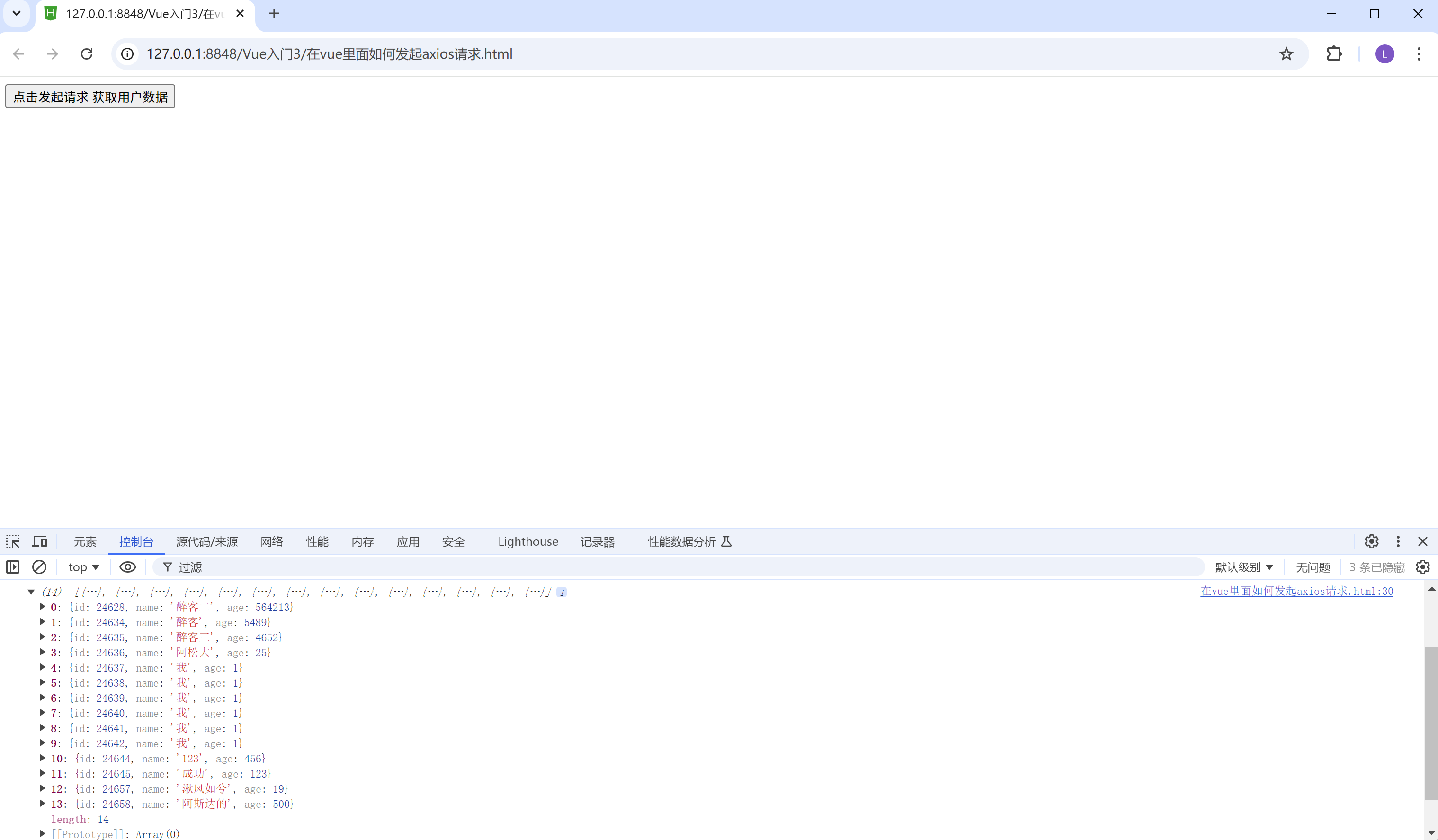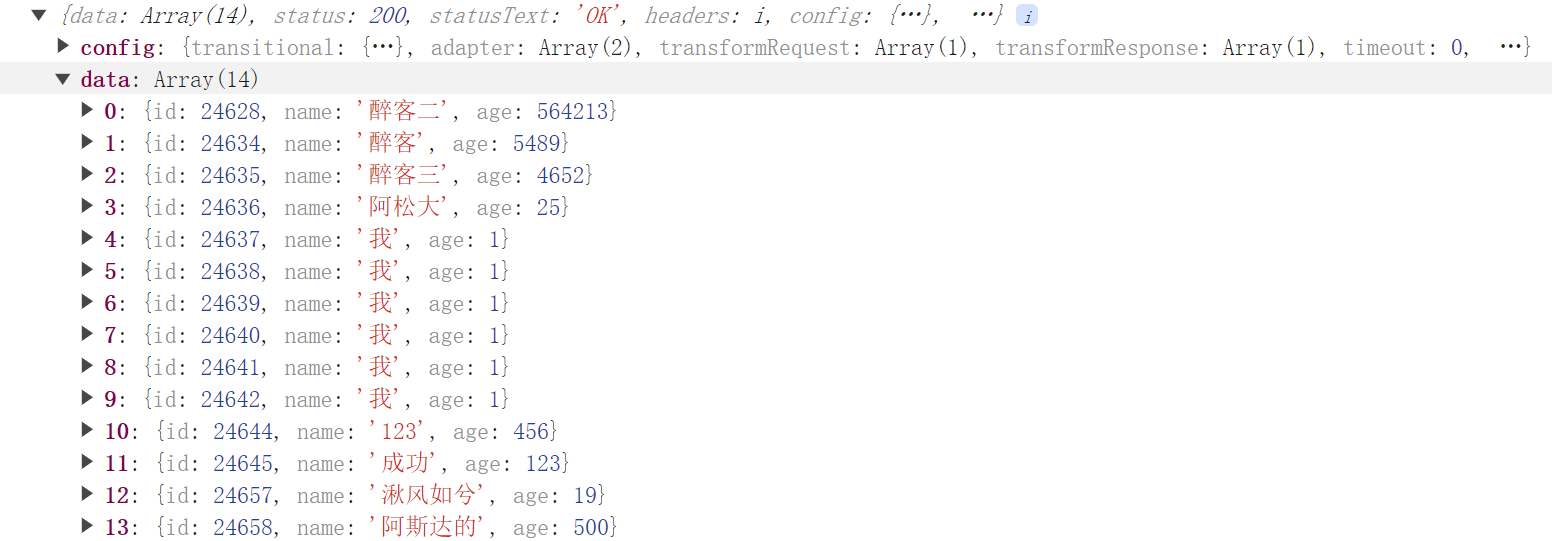 我们会发现, 有数据在控制台里面打印出来了, 没错, 这个就是我们使用axios来请求的后端的数据。